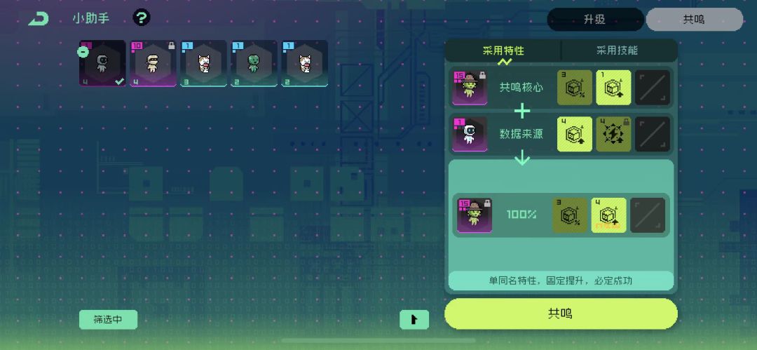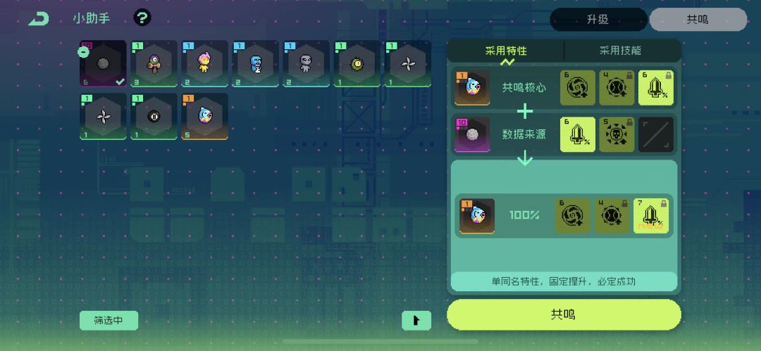 然后是特性升级:前提是主宠和副宠至少有1个特性相同,才能进行后续操作。
