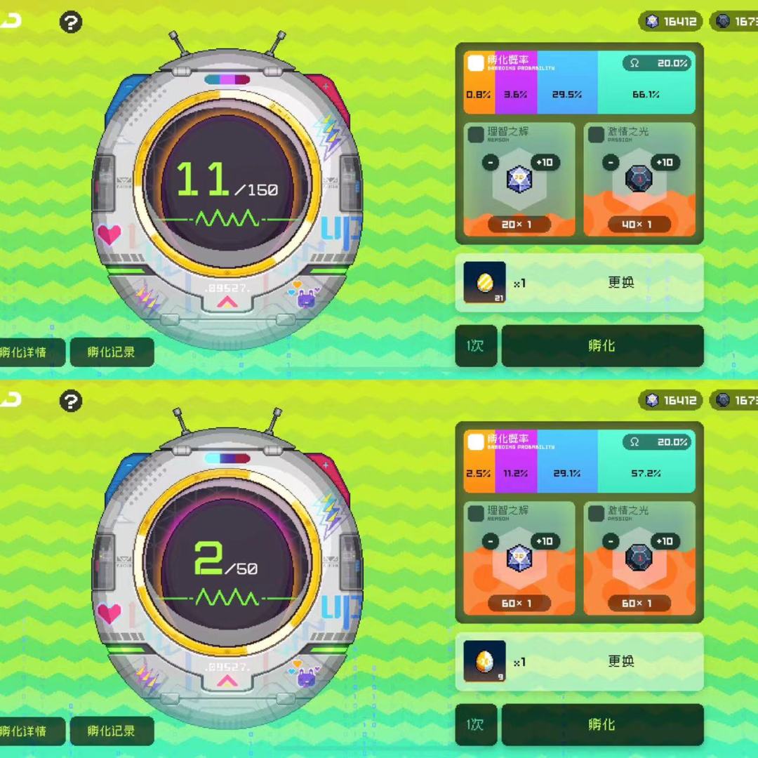 小孵化舱选择 理智之辉+激情之光=60,孵化出金概率0.8%。
