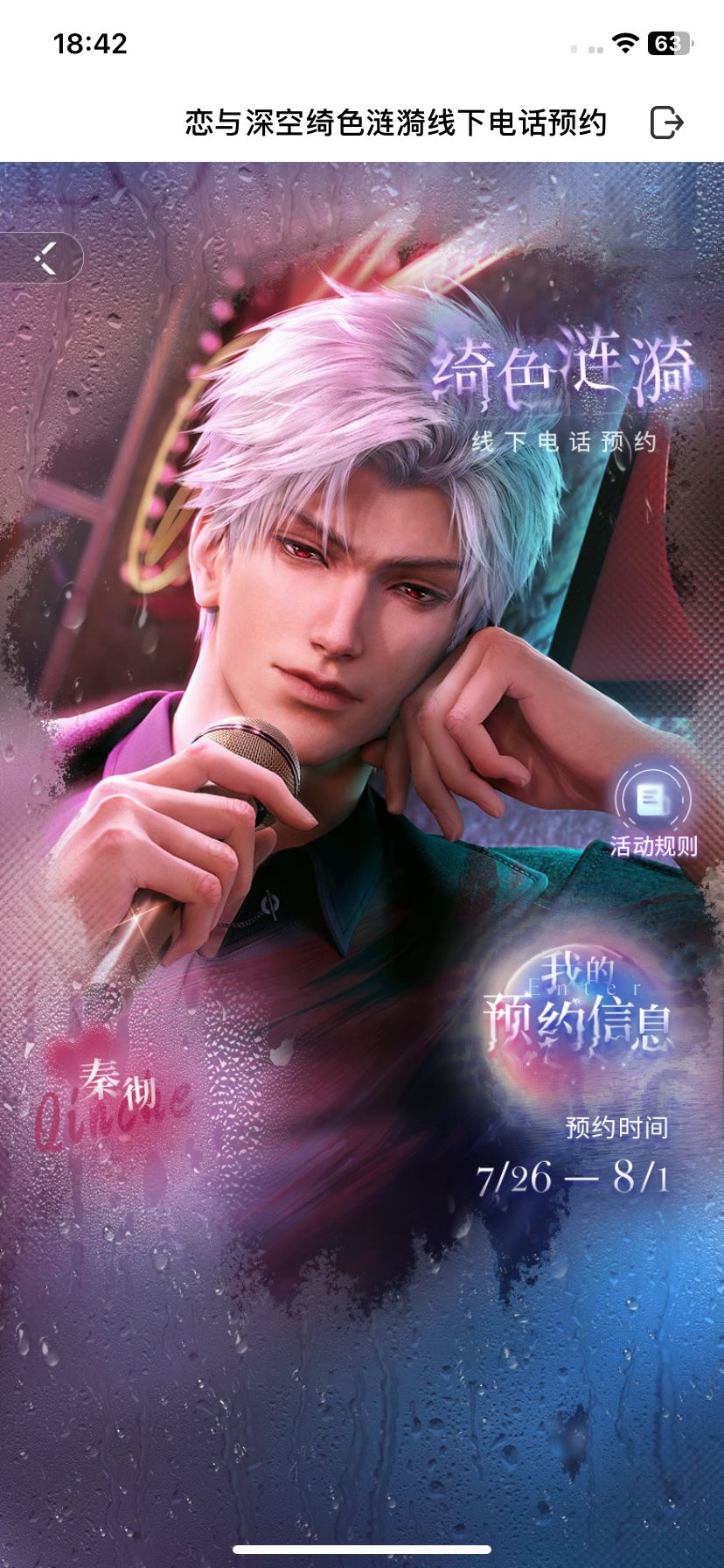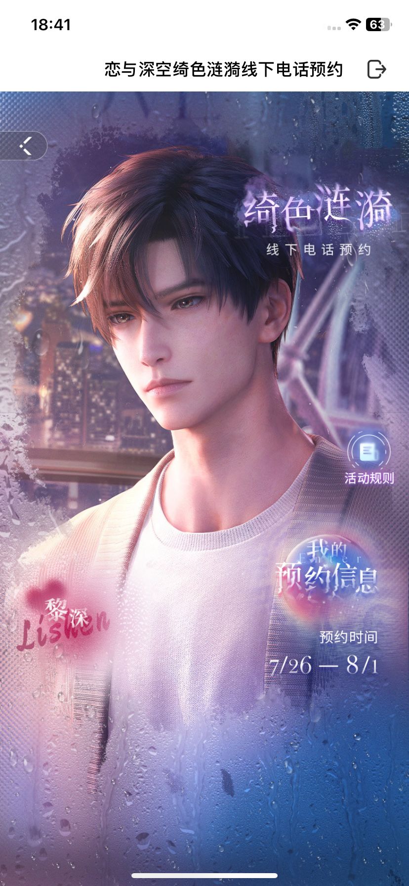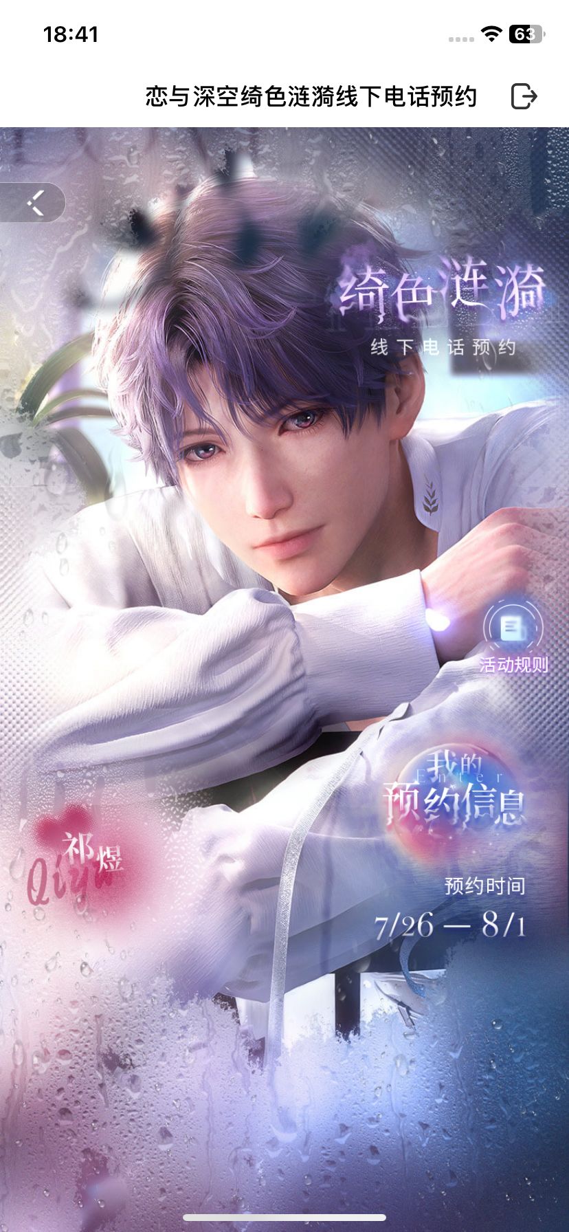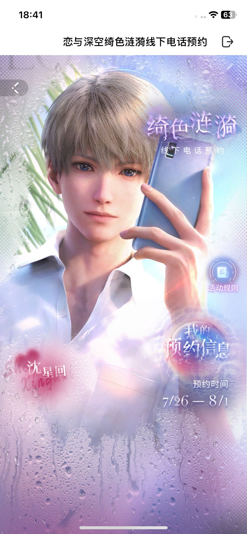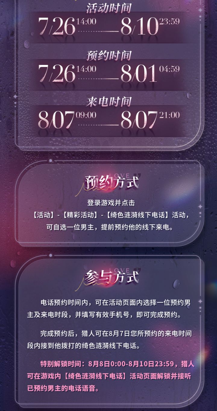 1.登录游戏,点击「活动-精彩活动-绮色涟漪线下电话」进入活动页面,可自选一位男主,提前预约他的线下来电。