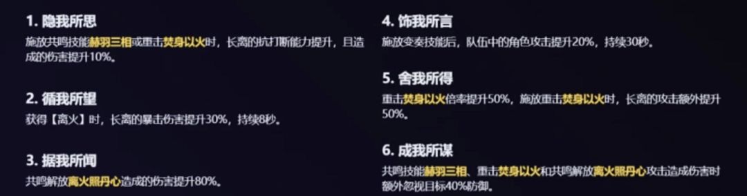 也就是说,强化A命中敌人获取一层【离火】,大招直接获取4层【离火】,重击【焚身以火】,也就是强化重击,需要叠满4层【离火】才可长按普攻释放两段超高倍率伤害196.25%+457.85%。释放强化重击期间长离收到的伤害减少40%,且此次强化重击视为共鸣技能伤害。