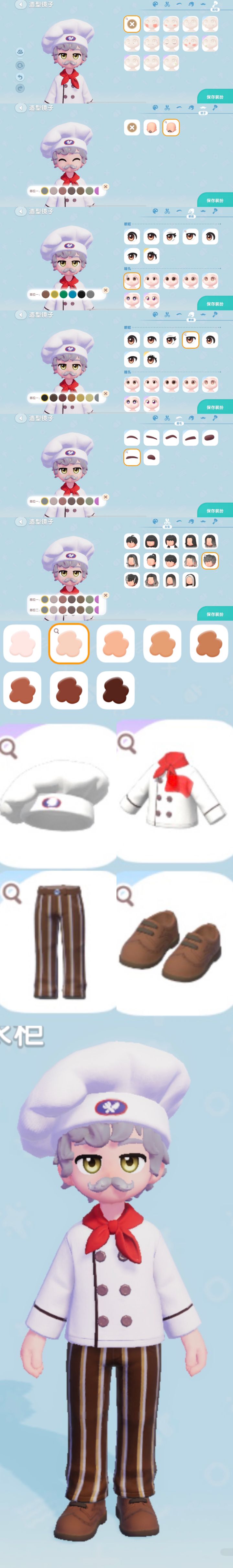如图3所示,厨师套装本身与马西莫本人穿搭是有所出入的,这里裤子应该换成【竖条纹长裤】颜色为“棕色系”(注意不要买成黑色)