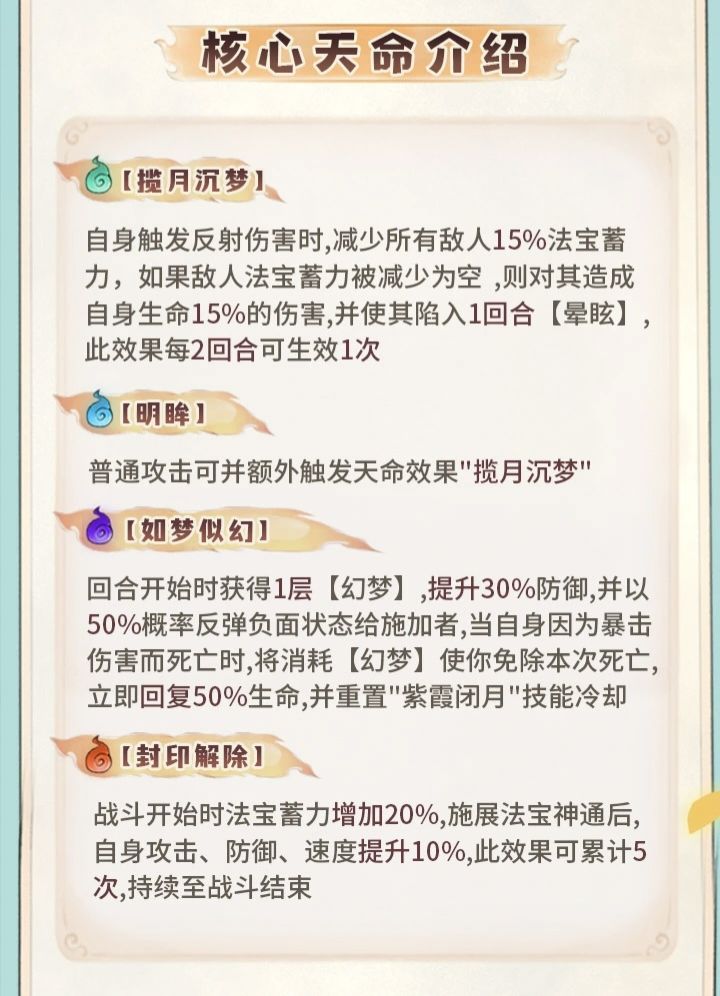 天命三能为紫灵提供30%防御,“梦幻”能使紫灵抗一次应暴击死亡的伤害(可以无视一次因囚龙爆死的禁止复活),50%负面反弹很好的克制对面给自身套负面效果。