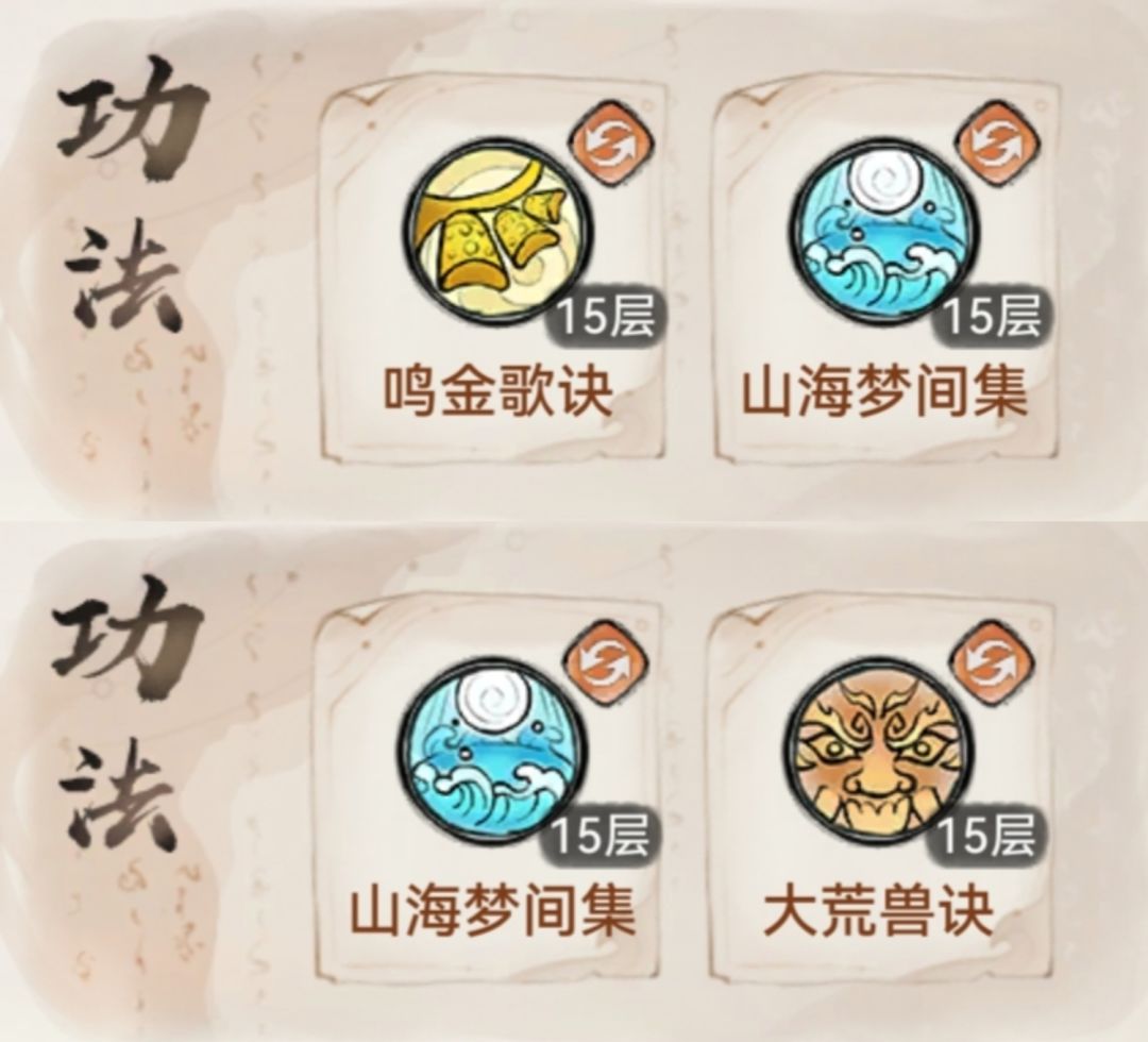 ①山海梦间集-金鸣歌诀(大荒兽诀),一个不主动释放的复活功法与加buff的再动功法,都能稳定的让紫灵释放自身的技能获得反伤来触发天命