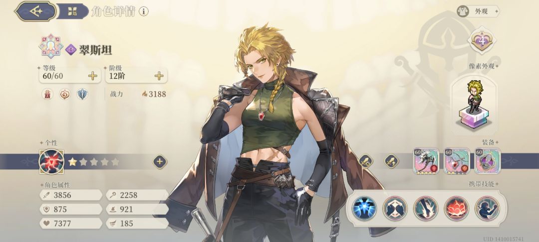 可以看到1星春哥参数还是很高的,特别是物攻参数,战力更是3100多.