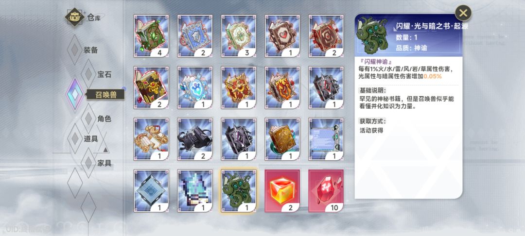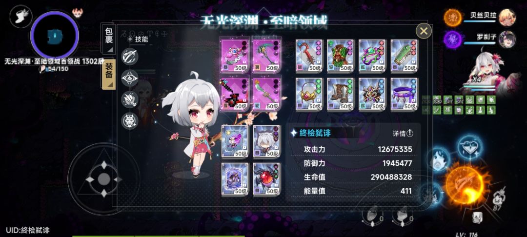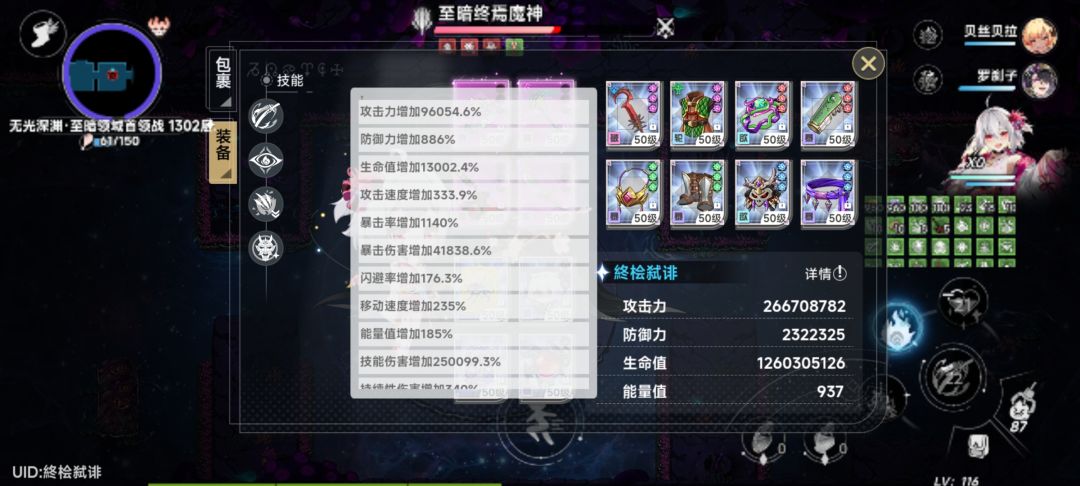 面板一览(非极限,只带了一本光暗书,上限应该翻近五倍 ,甚至能超过贝斯贝拉自己主战的技能加成)