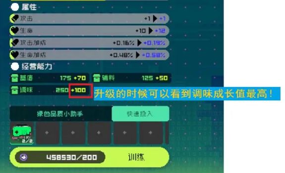或者你升级的时候可以也可以查看成长值高的是哪个,看下图,可以看到【最高营业属性】的每级成长值是100,其他是70或50