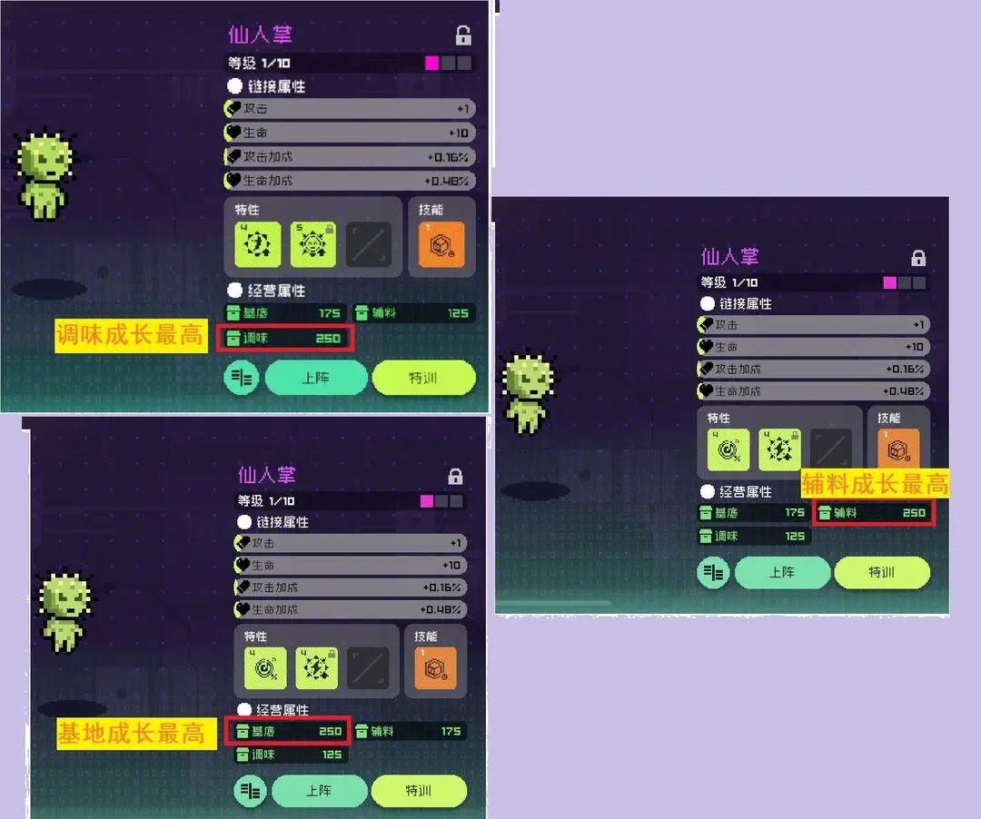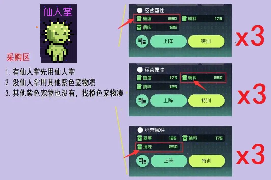 我拿仙人掌举例,同样的1级仙人掌,有调味是250的、有基地是250、有辅料是250的,这个250就是对应该宠物的【最高营业属性】