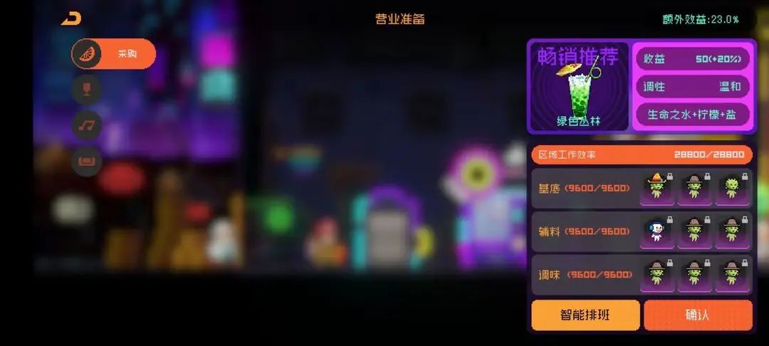 2.调饮区【最高经营属性】选种:强烈2只、温和2只、浓郁2只、清淡2只,共8只: