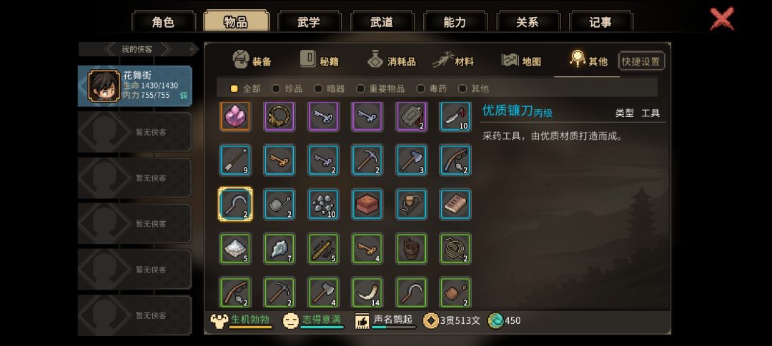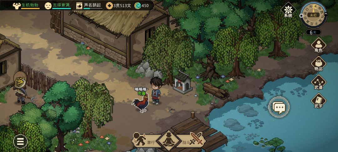 3.进入无名小村强烈建议拜师,测试版中拜师几乎是百利而无一害,师傅不仅教你各种武功,还会在你第一次没钱的时候给你5贯钱,第二次给你所有蓝色工具各2把。
