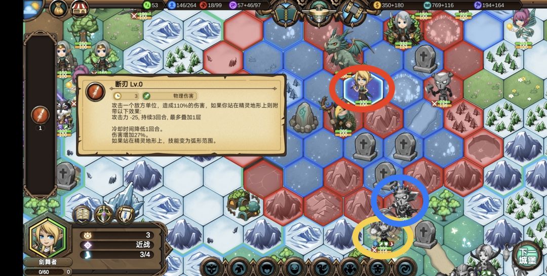 图中红圈内剑舞者技能能减少敌人攻击力,这里用蓝圈中的不朽王挡路去吃敌人的攻击,这样的操作可以简称为《吃控制》,去吃敌人的控制和负面buff