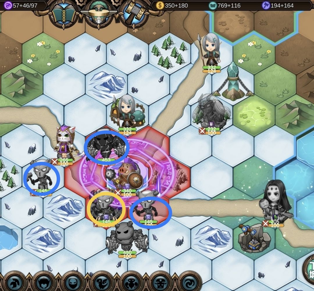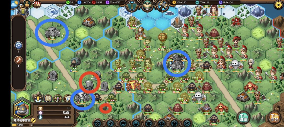 图2中最右边的蓝圈有我的城堡,其上飓风机甲首领在守城,敌人缺少控制用自带回血的高肉度单位守城
