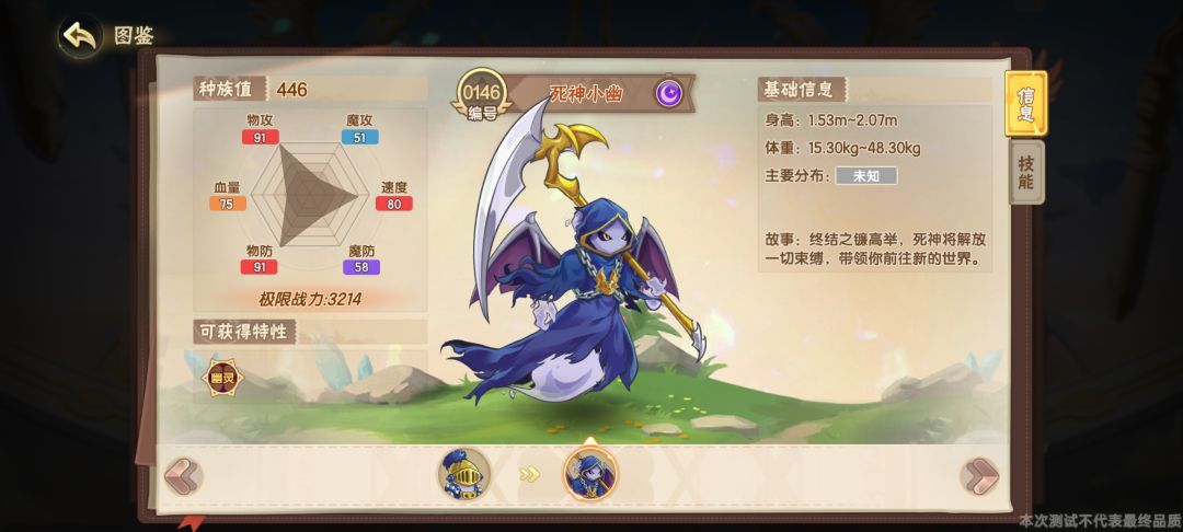死神小幽,三角形战士,登场200闪避的特性结合91的物攻种族值,让它更像一个暗夜刺客,技能偏向残血斩杀,拥有处决(面对半血以下提升百分之50威力),幽影斩击(无视对手所有防御类提升状态)。获取途径:永恒梦境。圣灵选择:6突击。