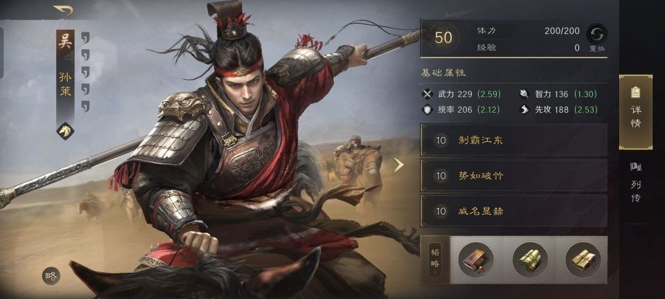 这一场战斗,大禹排出了雁行阵,孙策是唯一处在后排的角色,他获得了额外15%的伤害加成。战法搭配方面,制霸江东、势如破竹、威名显赫的组合,兼顾了倒戈和会心,加上专属金书霸王传和作战、孤军的善本,令孙策的整体生存能力也变得极强。