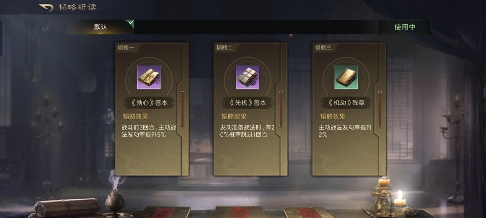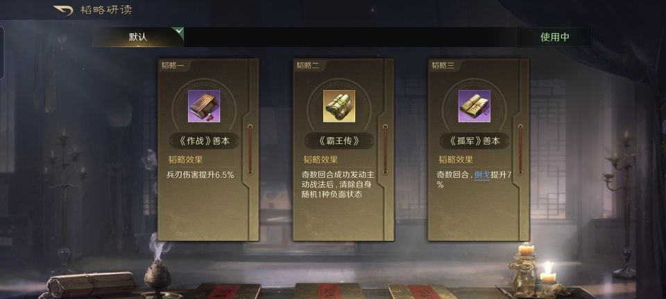 鲁肃在前排额外获得了20点的统率值,防御方面想必更具备抗打击能力。在划湘分荆的基础上,第二和第三战法依次习得了一计决胜和料事如神,看来除了缴械,鲁肃还要肩负起给对手施加虚弱和技穷的任务,这肉眼可见的是想要跟对面的小乔打擂台啊!韬略库的三本书,鲁肃选择研读了励心残章、金书治国论和守土善本,把断粮的功能也学起来了。对面大乔的回奶量,也得先问问鲁肃。