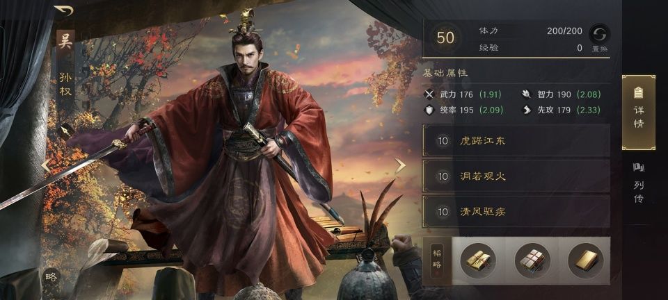 孙权之所以放在最后亮相,倒不是因为他本身的账面能力有多强,而是他的虎踞江东总是逼得咱重新计算队伍里全体成员的主动战法发动率。毫无例外,洞若观火和清风驱疾都是主动战法,则全体角色的主动战法发动率都得以额外提升14%。励心善本、先机善本和机动残章又额外给孙权带来了7%的发动率提升,孙权自身携带的洞若观火就有71%的发动率,清风驱疾的发动率更是高达81%,我感觉没人能奶过他了。