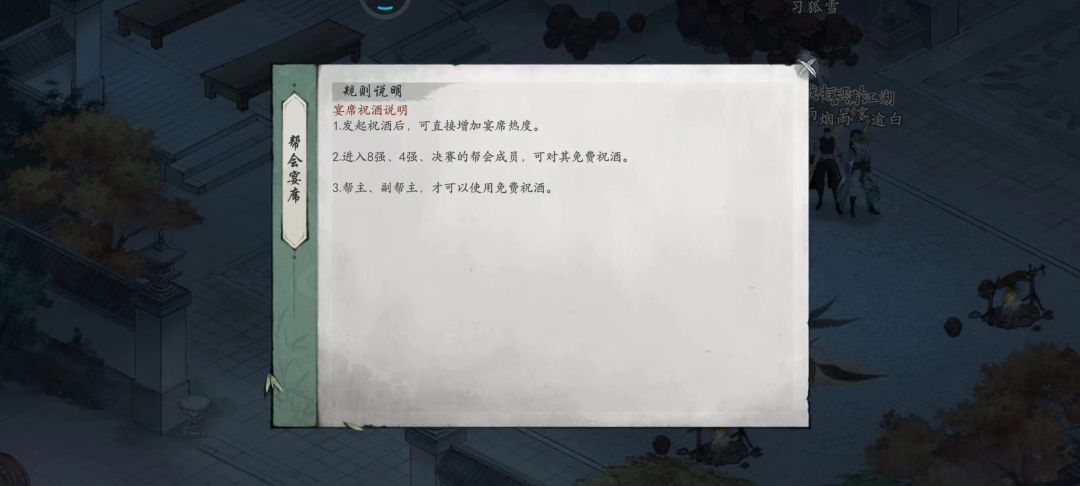 祝酒:消耗元宝288给指定人祝酒,可增加热度10点(是否增加对方醉意不清楚)。当玩家进入论剑8强、4强、决赛时,帮主和副帮主可以为其免费祝酒。(可能有BUG,有人反馈依然会消耗元宝)