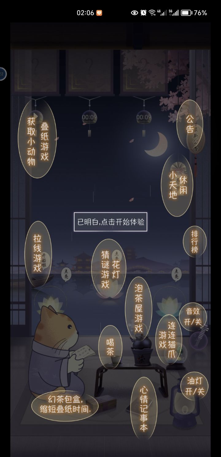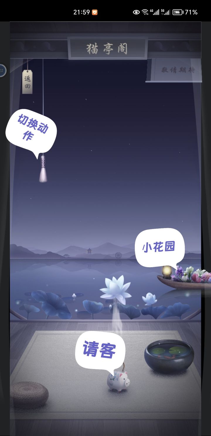 左上角特别大的卷轴就是折纸了,寻梦那个是类似华容道的连线游戏,湖面上的三朵莲花是猜谜,船是翻绳,屋子里地上木盒是茶包,目前不清楚具体使用效果,本子是笔记,可以随便写点东西,油灯可以点亮或者熄灭,雪景球是打地喵游戏,就记住喵爪出现的位置,划过相应的洞口(但毛球不划),那个乐器(阮?)是音乐开关。茶壶是茶屋入口,会打开图二的泡茶界面,泡茶退出来是图三的茶亭,可以坐花船去小花园种花、请客喝茶得提示,或者拉左上角的穗穗,有几个互动的动作(吃饭喝茶看书织毛衣)