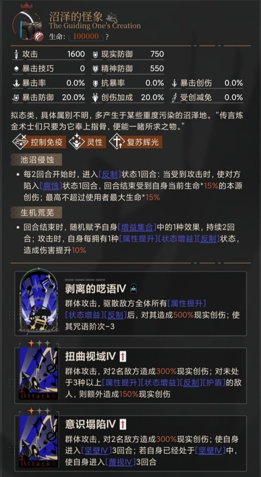 首先,该BOSS每2回合,会为自身上[反制],持续1回合;每回合,又都为自身施加[增益集合]中的1种效果。该BOSS身上的状态([属性提升][状态增益][反制])的数量越多,造成的伤害即越高。