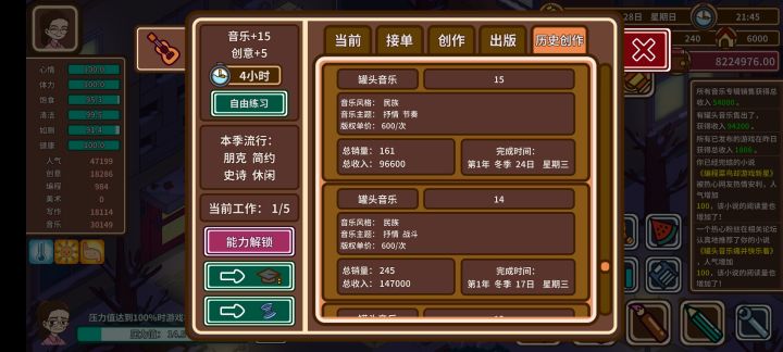 已经sl麻了。 结果大致符合预期,罐头音乐因其100%纯利润(小说漫画画集专辑算总收入通通得打折扣)、不受流行影响、不受仓库上限限制、单个罐头收益只会随时间递增等原因,堪称后期神器,我一共做了89个罐头(到最后一个冬季就停了),此时的收益最高刷出来过11W5,销量最好的罐头被卖了245遍。缺点就是完全没有前期,即使音乐课毕业收益浮动也极大,当然,你可以靠反复读档刷出需要的金额。