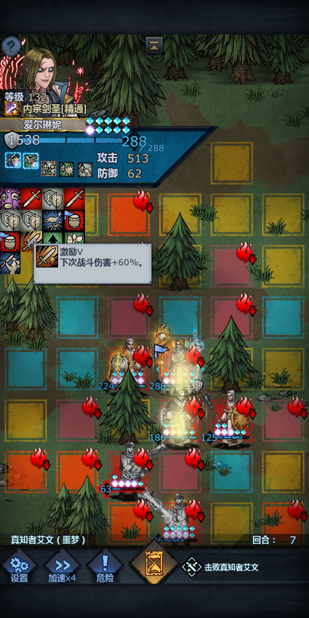 6.关于尽量保证雷主有六格能量用来复活,其中三格的能量用来在被boss攻击后复活,另外三格能量属以防万一,被boss施展狂风震击击退后如果踩上地上有火焰标志的格子会再受到火焰伤害