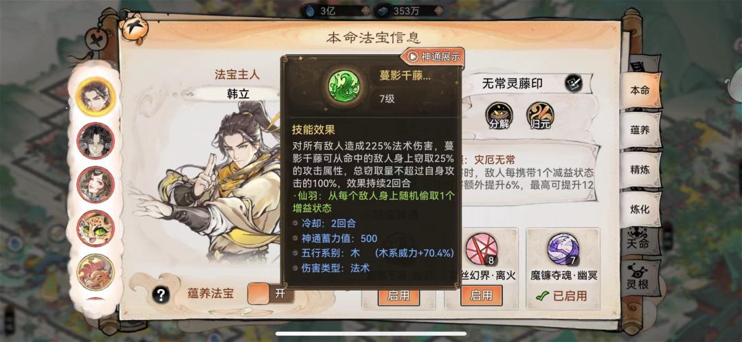 首先,韩立必须要有灾厄无常的本命法宝。因为他是不吃元素加成的。所以想要秒后排,触发青莲被动,就必须靠灾厄无常的增伤。但是记住一点,虽然很多攻略会推荐,炼藤作为法宝技能,但是这是误人子弟的。藤除了它的元素加成,可以增加青莲的伤害以外。完全是负收益。会破坏韩立的循环。韩立的法宝蓄力太快了,而藤的伤害又太低了。记住一个核心,韩立的收益要最大化,就是要尽量多的放青元剑芒。