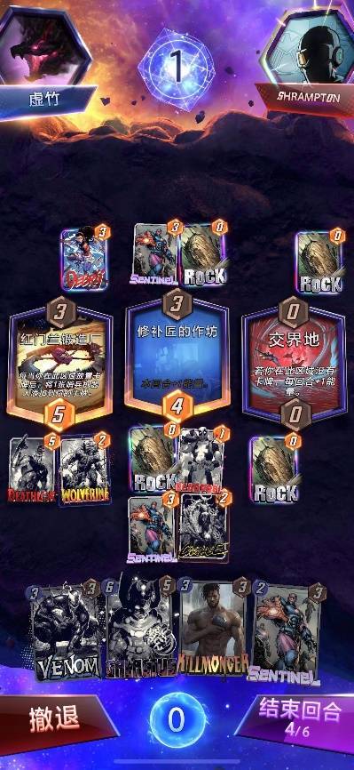 第四回合:对手三回合只打了一张哨兵,可见这局对手也很卡手,这里其实已经可以点snap了,但因为考虑用吞星,可以再等等看看局面,本回合打了卡耐基在中路摧毁死侍,金刚狼在左路补战力。
