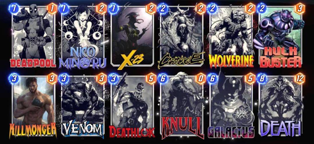 毒液:毒液,摧毁流卡组中最最最核心的大哥,没有之一。毒液在摧毁流中的打法是尽量在第五回合吃掉死侍或金刚狼,从而最大化战斗力,甚至在最后一回合配合电视机可以打出奇效。