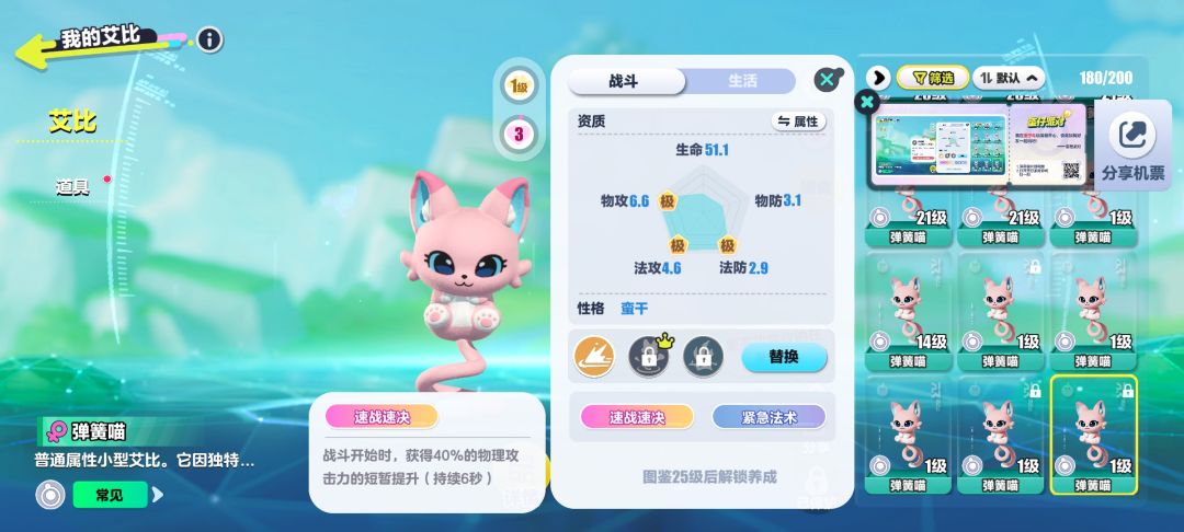 我在查看背包时,发现不知道什么时候出现的极品弹簧猫,虽然不是闪光✨的,但是资质极品,性格也对上了,专属技能也有了,天性速战速决也是对物伤的加成,感觉这只太厉害了。