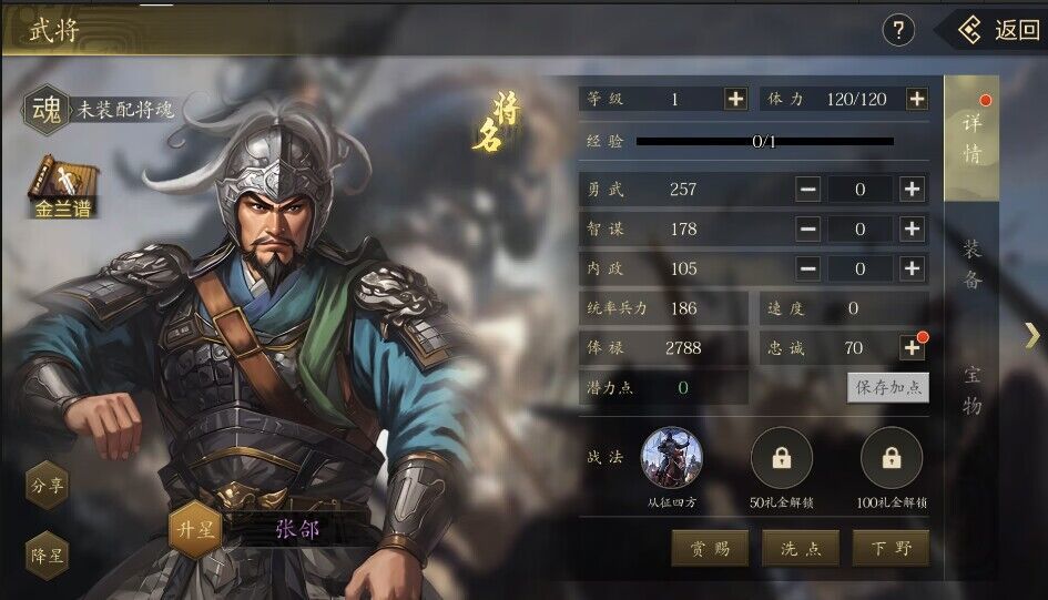 武将首次洗点公式是:潜力点=等级+(勇武值+智力值+内政值)*0.26