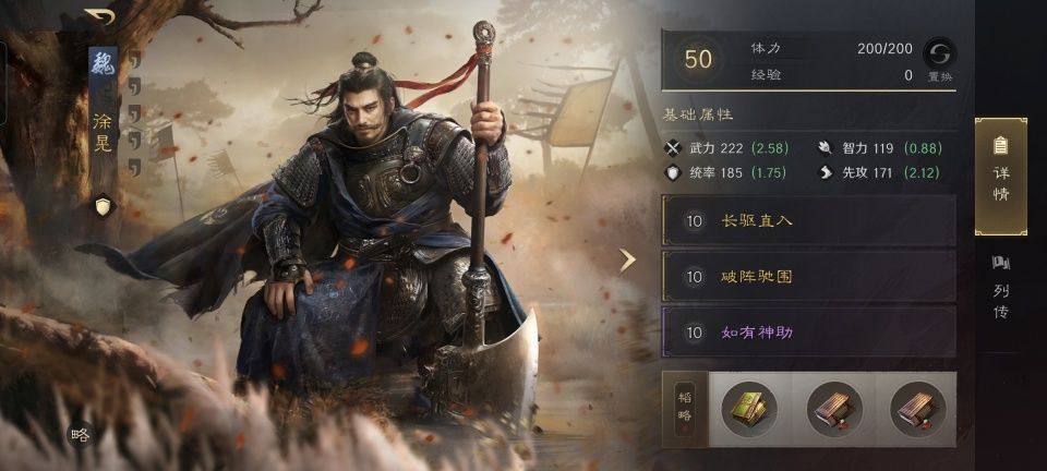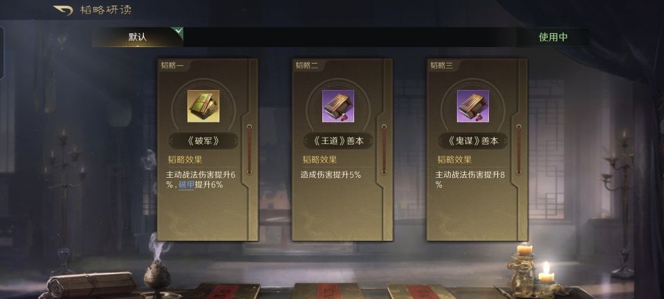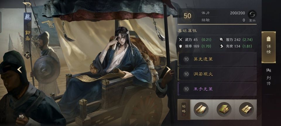 紫猫二世此战没有选择什么特殊阵型,就是随手摆了个一字阵,是我的话,看在徐晃和郭嘉的面上,起码也得出个鱼鳞阵,让邓艾顶在前头,郭嘉和徐晃在后面点亮奇谋和会心。不过对方既然是一字阵的设定,咱也就只能默默接受了。郭嘉在算无遗策的基础上,第二和第三战法分别学习了洞若观火和束手无策。韬略库的三本书,则由机动善本、励心善本和十胜论构成。算上这些主动战法发动率的叠加效果,郭嘉所携洞若观火的发动率提升到了64%,关键还是束手无策的发动率,也被提升到了59%!
