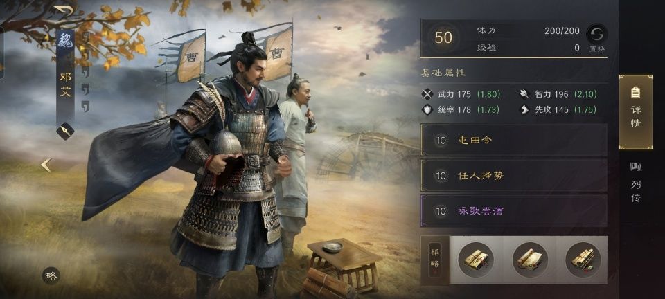 BUFF的叠加到邓艾这里依旧没完,这支队伍里的邓艾并非纯粹的奶爸。屯田令和咏歌尝酒之外,邓艾还额外装备了任人择势,只要打过了第三回合,郭嘉和徐晃都将因为邓艾而分别获得奇谋和会心。邓艾的韬略库搭配,显然也是围绕着给郭嘉和徐晃服务而做的。延气、勤先的善本和济河论,点亮了破甲和看破,这对于郭嘉和徐晃而言,无疑将创造出更大的伤害量。