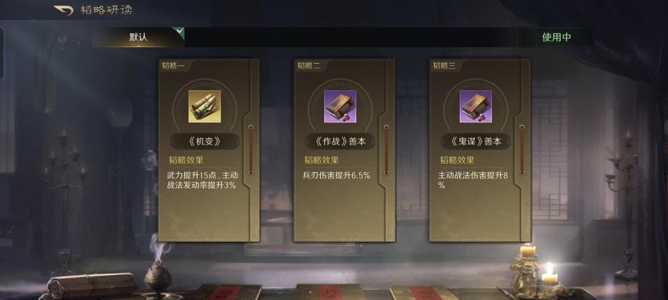 张郃的韬略库里研读了专属小金书机变、作战善本和鬼谋善本,主动战法发动率得以提升3%。还是要结合孙权的虎踞江东来计算,大破街亭、势如破竹和战八方的发动率分别被提升到了77%、67%和72%。