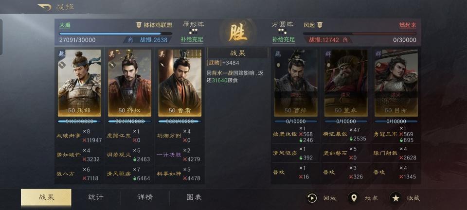 如此一番筹谋之后再开战,鲁肃全场贡献了3次划湘分荆和一计决胜,以及4次的料事如神,对面徐庶除了打出2次普攻,愣是被限制到一个像样的攻击技能都放不出来。加之张郃表现神勇,5次大破街亭,3次势如破竹和4次战八方,总伤害量轻松突破2万大关。详细的战报统计图,也是能看出张郃每个回合都是头号输出,这是一场毫无争议的漂亮仗。