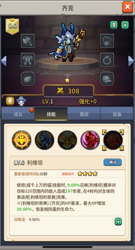 - 技能效果:使用[成千上万的锚]技能时,9.00%召唤[利维坦]概率对目标320范围内的敌人造成197伤害,在4秒内对全体同事适用[利维坦的恩典]效果。※[利维坦的恩典]:[齐克]的HP基准,最大HP增加20.00%,恢复相同量的生命力。