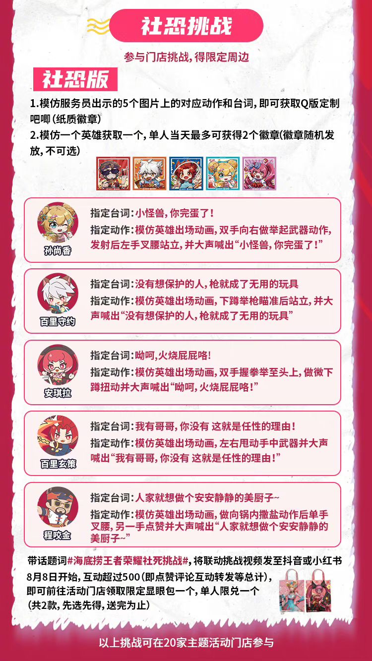 本次联动设置了多个活动,完成挑战可以获得围兜/徽章等限定周边,还有跳舞/喊台词等社死挑战