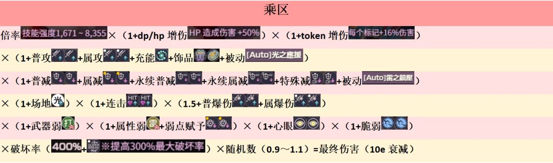 这次主要详细介绍饰品,首先得需要了解伤害是怎么打的,大家可以先看下第五个图,这么多buff全是乘区,比起叠加同一种buff,不如叠加多种buff,所以一个角色有多种buff技能就算是t0,甚至有些卡的一个技能就有多种buff,更是t0中的t0,前者当然还要考虑sp够不够,而这些buff的效果量就跟属性有很大关系,当然技能等级也很重要,这个先抛开不说哈哈。