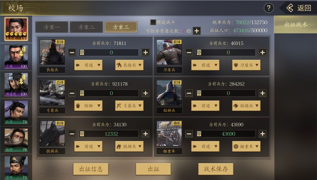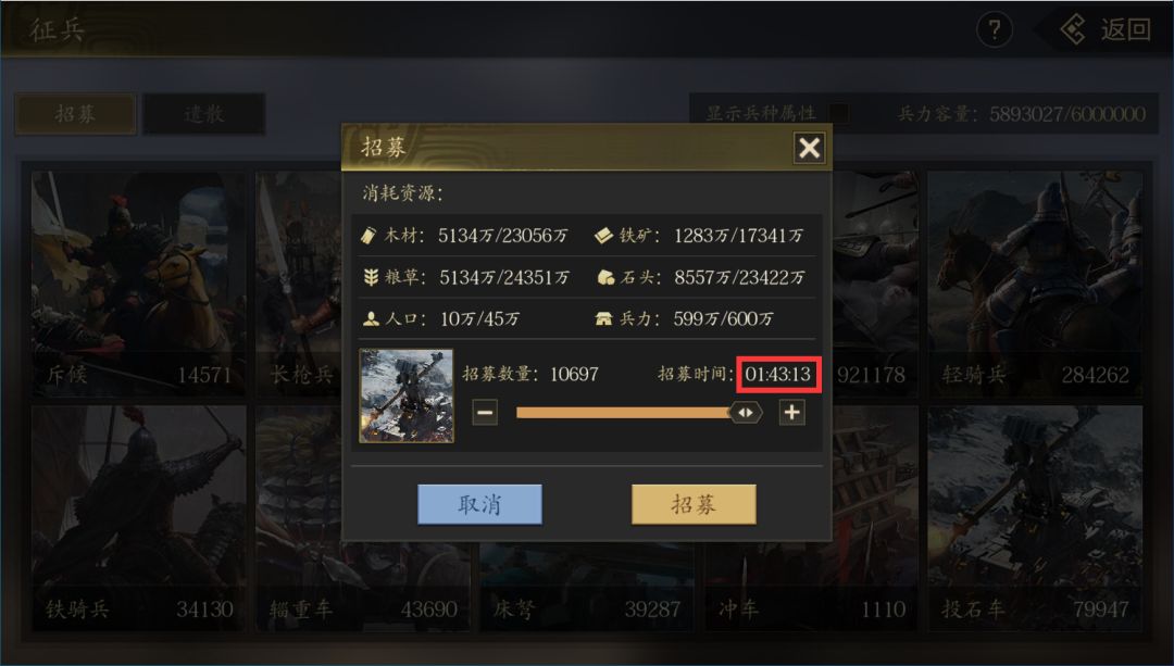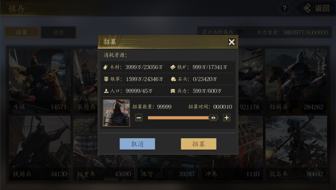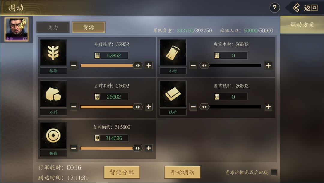 2、把城里所有的兵力和资源搬空(先设置兵力再进行资源调动,辎重车可携带大量的资源进行调动)。并且玩家可以训练多支队伍用分城同时暴兵,提高暴兵的效率。