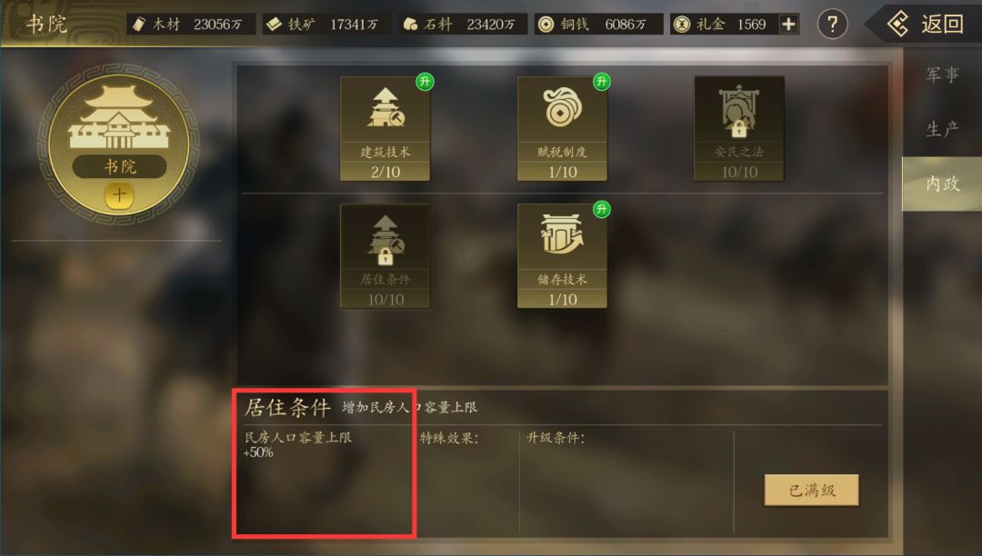 2、提升书院中的居住条件科技,可以大幅提高人口容量上限。