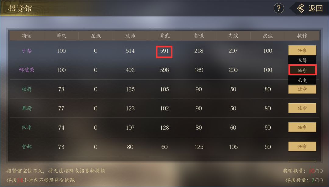 1、在我们获得了更多的人口以后,可以召集更多的高级兵种,但是高级兵种征兵的时间比较长,我们可以将勇武属性最高的将设为城守,以此最大程度地减少征集的时间。(注意要先用武曲星护符,再设立城守,最后再征兵)