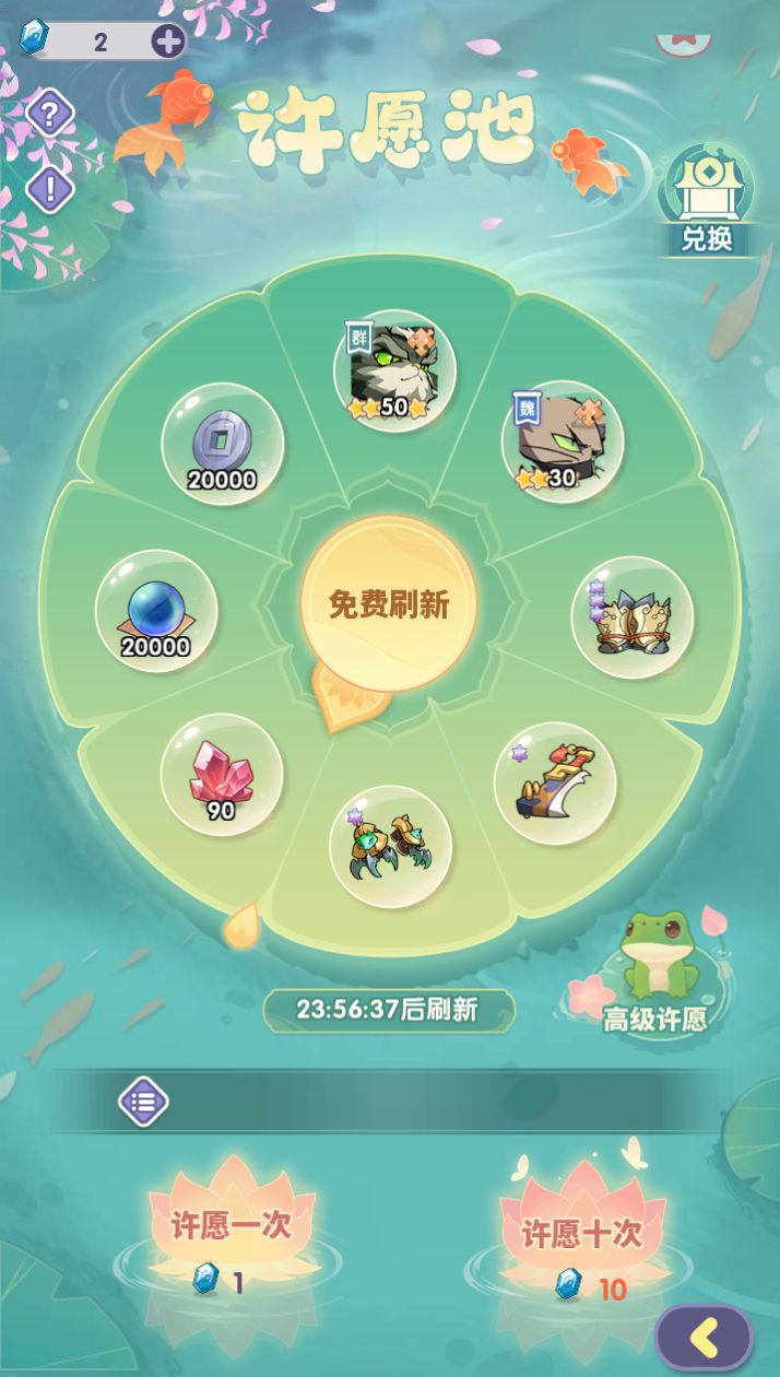 初级许愿抽奖一次将获得10个许愿币,高级许愿抽奖一次将获得50个许愿币,可以在道具兑换中兑换道具
