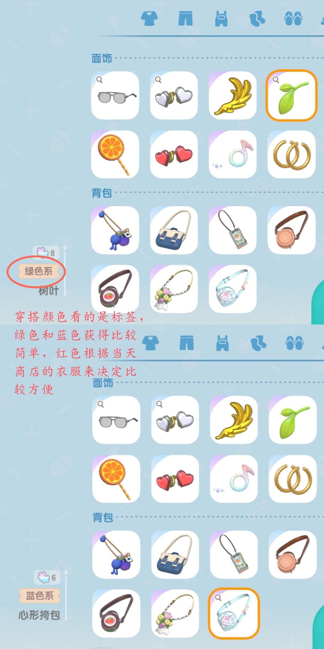 多萝西需要的红绿蓝穿搭不限位置绿色用签到送的树叶,蓝色用棉花糖套装的挎包比较简单,重点是要看部件的标签和它看起来有些什么颜色没有关系!