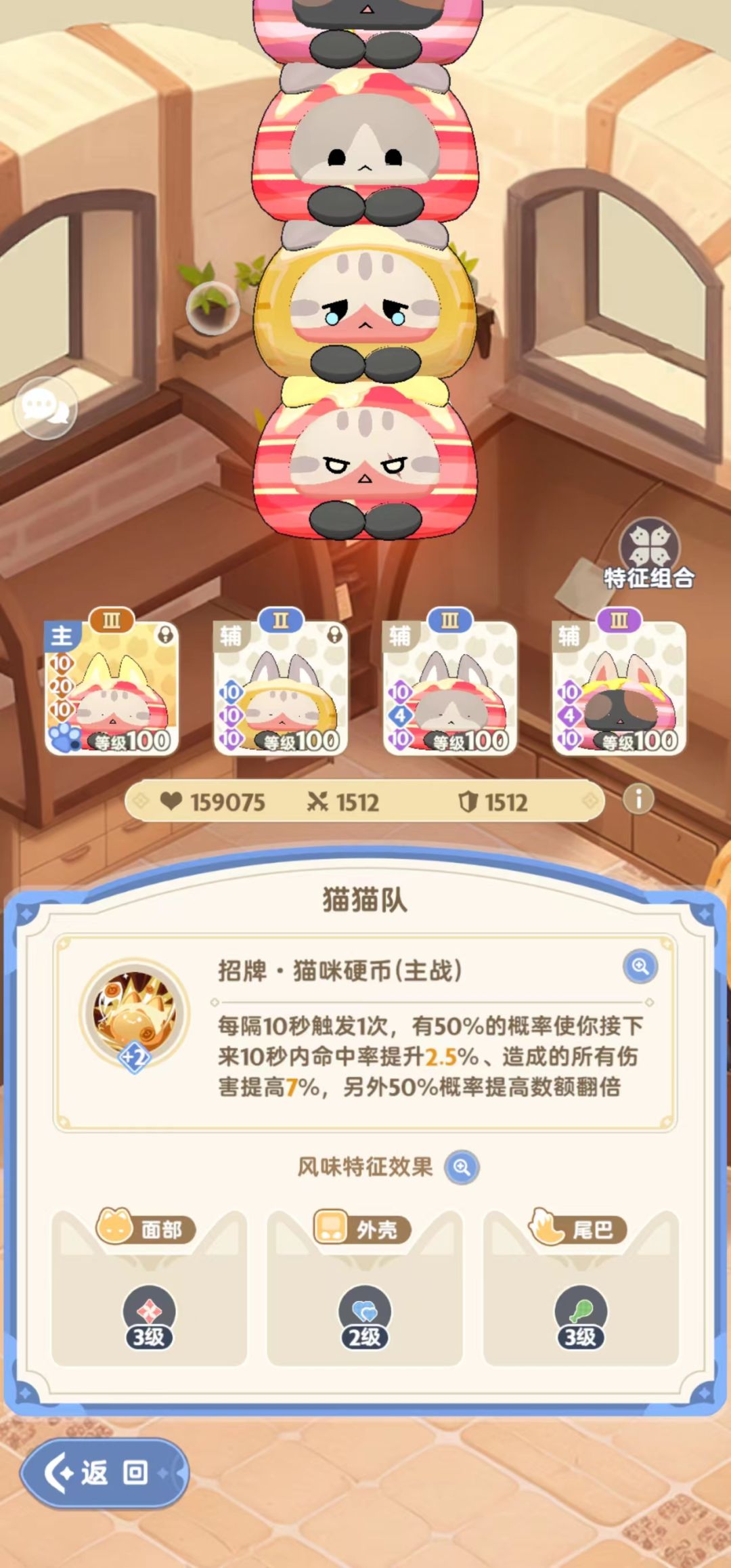(4)猫猫包:技能优先度是猫咪硬币>超持久标记>我们联盟>猫猫猎手。在猫咪硬币紫爪4前,我认为凑特征优于全UR,凑特征的优先级为面部3级>尾巴3级>外壳2级,面部特征优选帅气和恬静,3级面部至少加5%伤害,尾巴特征最优为柔柔,但是也无需刻意追求,以能凑出3级为主,可以增加2%的命中,个人认为命中属性还是比较难堆的,尾巴3级可以给装备及麦乐兽留一些堆其他技能的空间。