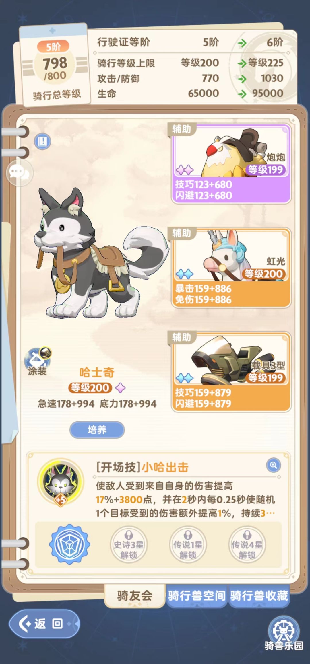 (3)骑宠:针对选择虹光还是哈士奇,有很多讲解的帖子,我选择了哈士奇,个人认为伤害加成优于攻击力加成,这块我没有做测试,大家还是多参考其他人的分享。