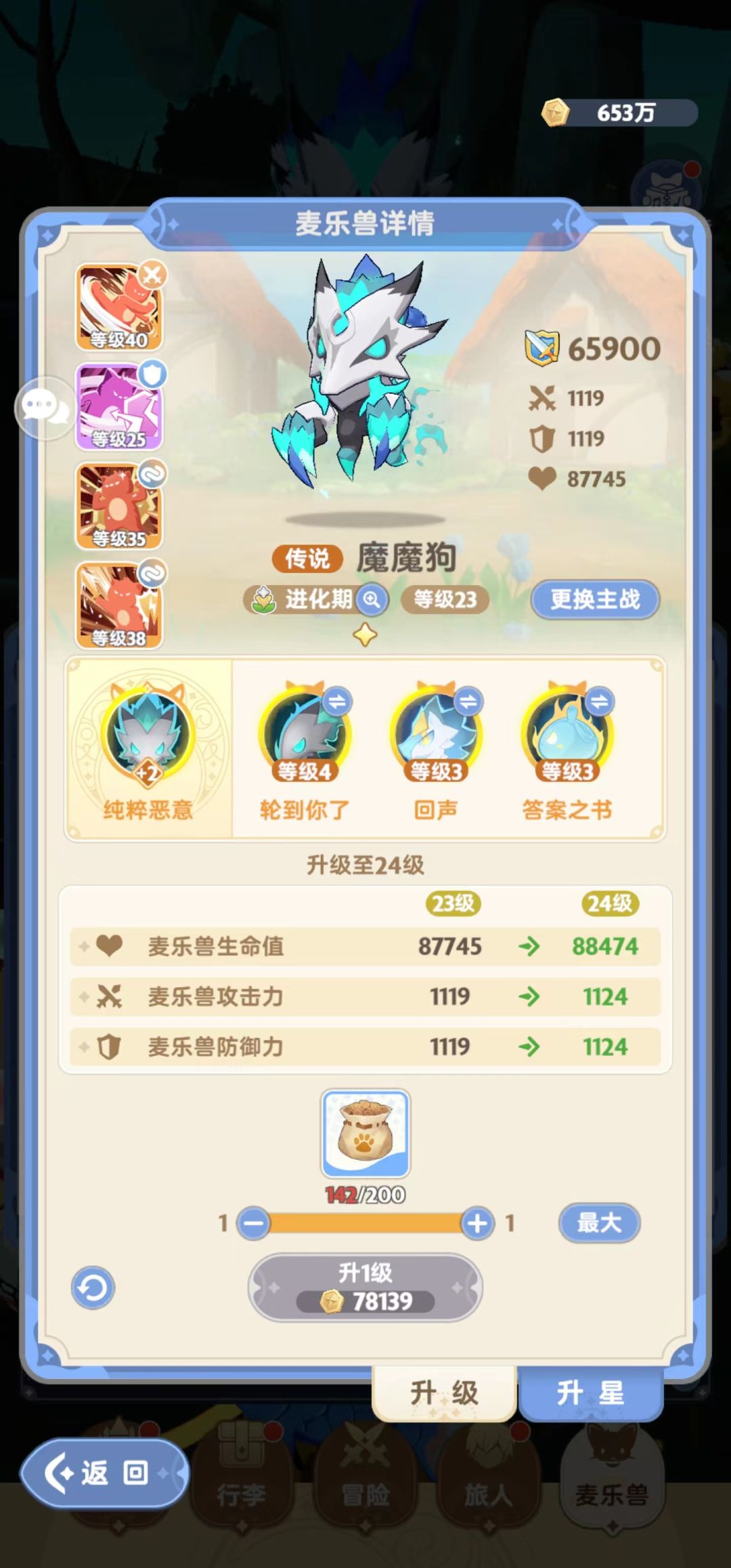 (2)麦乐兽:麦乐兽肯定还是选择魔魔狗,在资源有限的情况下,我认为特技的等级优先于麦乐兽升星,在保证金1的情况下下,我是尽量提升特技为主。招式的选择方面,攻击型尽量选择暴击伤害,其他招式用来平衡面板达到基本要求。妙想成真优先满足招式全部升级到25级,再将暴击伤害吃到40级,而后可以选择使用妙想成真进阶或当做经验来吃。