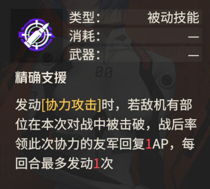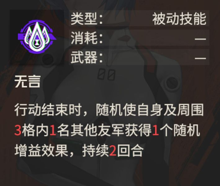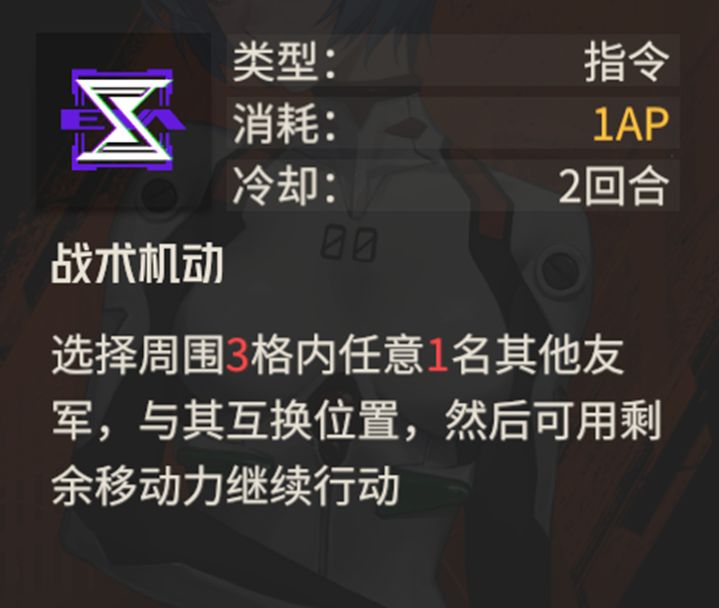 作为驾驶重型机兵的守护者机师,零的移动力依旧只有3点,但是战术机动技能却能变相提高零的移动力,通过远处的队友互换位置,加上y1区等级三效果,绫波零一回合最多能够移动8格,这样可以快速跟上大部队的队友。战术机动用处也很多,不仅能够实现快速移动,也能够让深陷敌阵的队友脱离险境