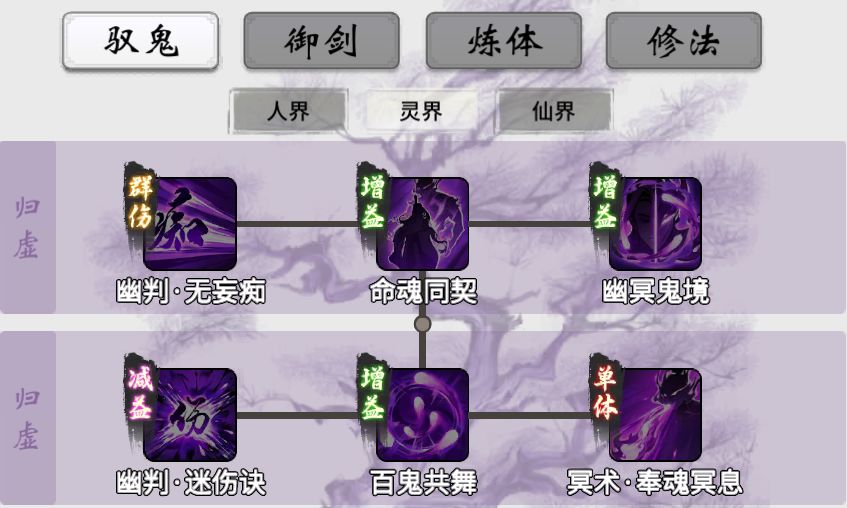鬼修归虚期包含2个判官流神通,分别为“幽判·无妄痴”、“幽判·迷伤诀”。