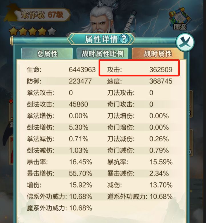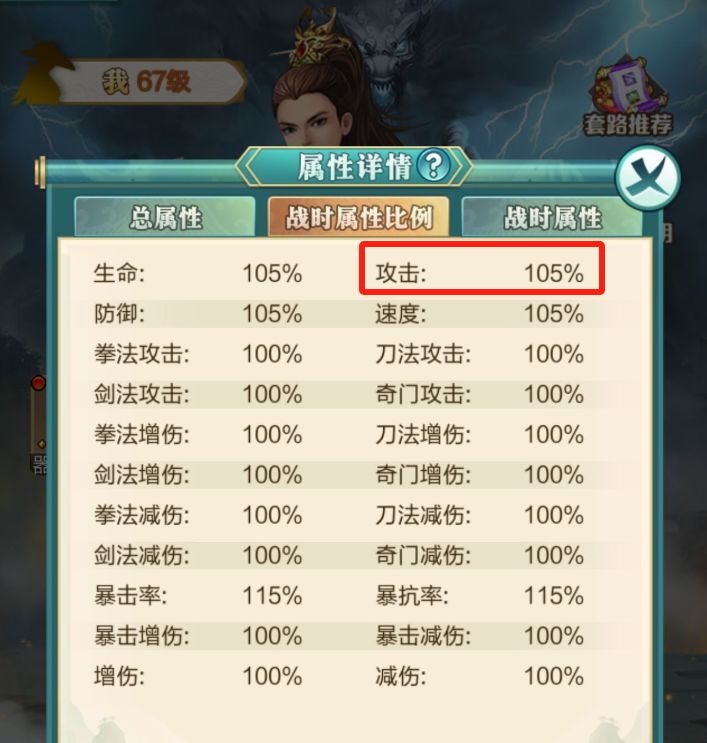 主角攻击战时属性比例为105%,即【基础】战时攻击力的1.05倍。