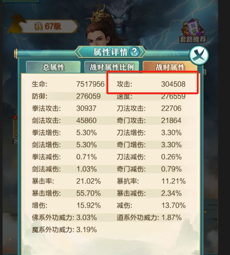刚才通过老宋,求得当前【基本】战时攻击力=290007.2,因此主角战时攻击力应为290007.2*1.05=304507.56