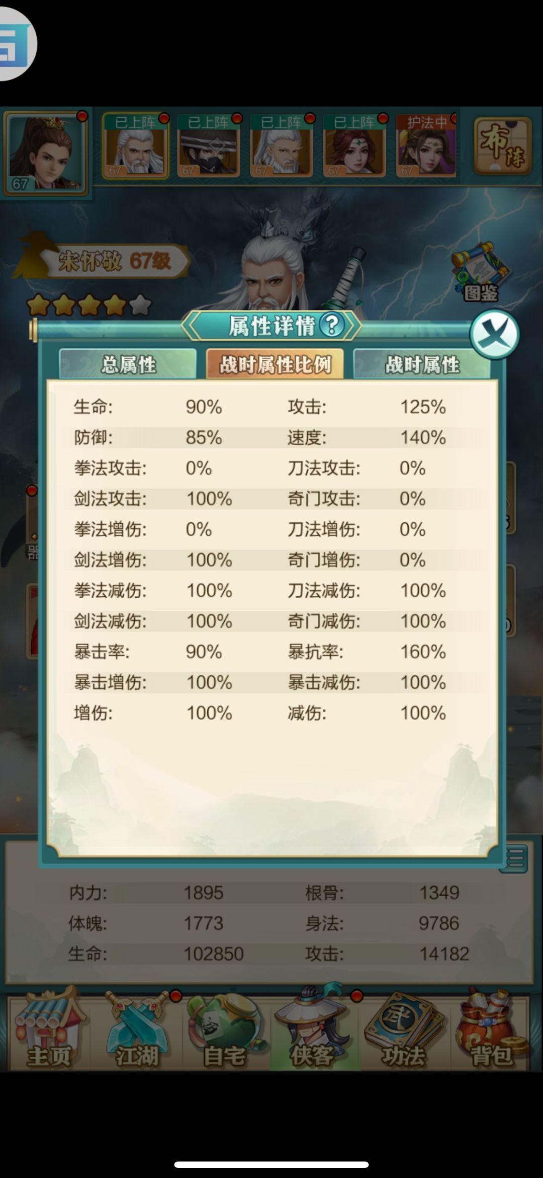 每次战斗最多可上阵5名侠客(含猪脚),但实际上,上阵侠客的战斗属性,都是基于主角。更精准的说法是,基于【基础属性】。这个解释起来不好理解,请看数据: