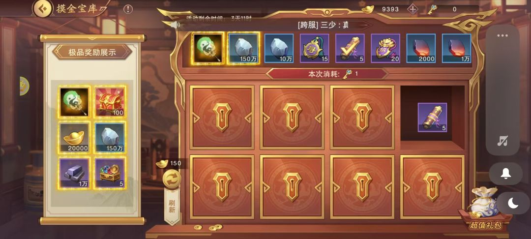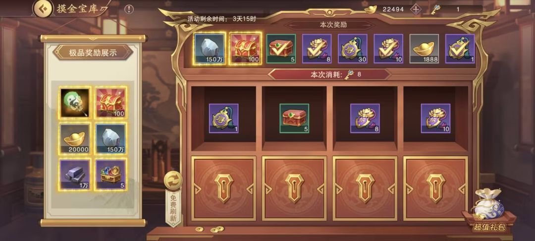 ①通过元宝可刷新宝库内的宝藏,同时通过消耗宝库秘钥可打开宝藏,每次消耗的宝库秘钥数量分别为0、1、2、4、8、16、32、64,即打开全部宝藏共需秘钥127把。根据宝库秘钥的价格,完成一轮需花费648元。